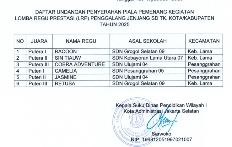 Diakhir upacara, diberikan penghargaan kepada pemenang Lomba Regu Prestasi (LRP) tingkat Kwartir Cabang Jakarta Selatan. Alhamdulillah Kwartir Ranting Kebayoran lama mendapatkan 3 pengharggaan, yakni Juara 1 putra, Juara 2 putra dan juara 3 putri. data lengkapnya adalah sebagai berikut.